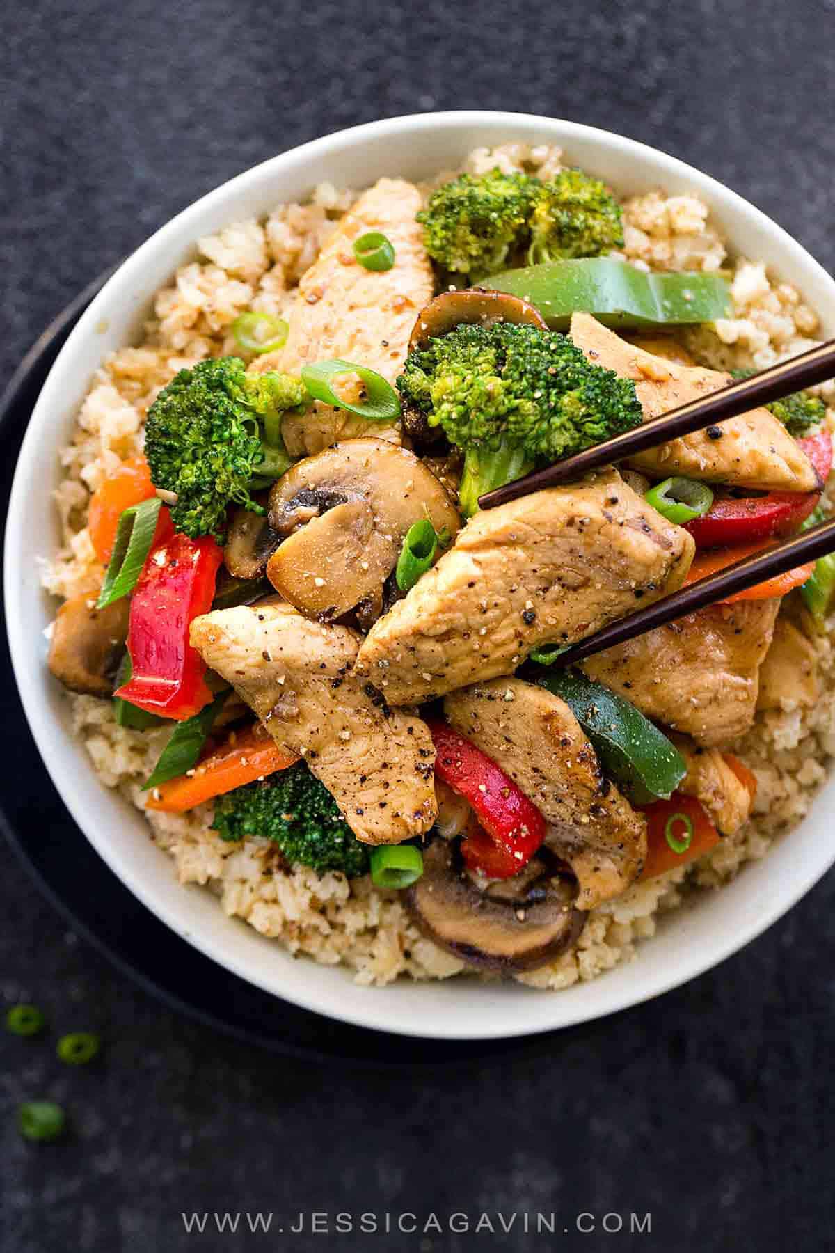 中国鸡炒配方旨在遵守全30饮食计划。在炒锅中煮熟的快速健康的单锅饭。每份服务都用瘦蛋白和新鲜蔬菜堆积在美味的酱汁中。