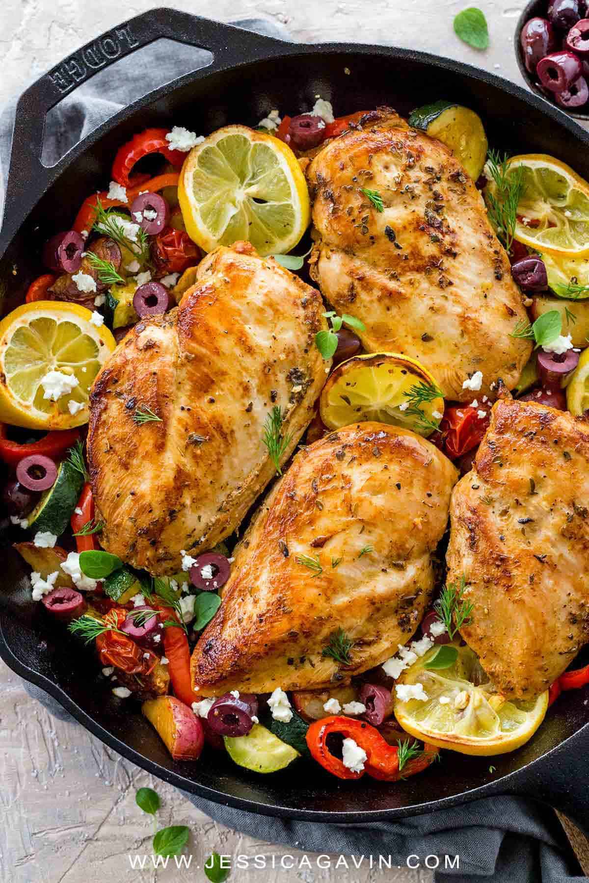 这种简单的希腊鸡肉晚餐是一家新鲜的地中海风格的食谱,在一个煎锅中煮熟。嫩的鸡肉用草药和香料调味炒创造一个美丽的金色外壳。然后将这种瘦白肉蛋白质在滋润的蔬菜床上烤,如西葫芦,土豆,甜椒和西红柿。