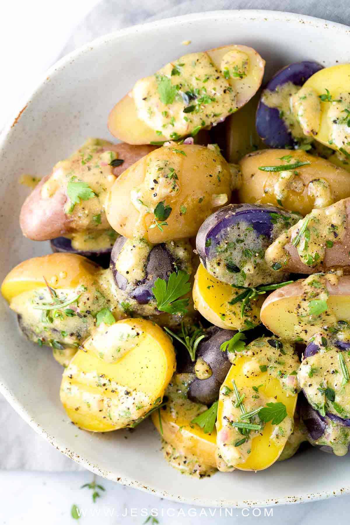 浓郁而柔滑的醋油沙司为这道即将被高度要求的配菜添加了大胆而新鲜的口味。下次聚会你要用这些小土豆做什么?请在下面的评论区告诉我,或者我可以给你一些我的配对建议,我在这里提供帮助!