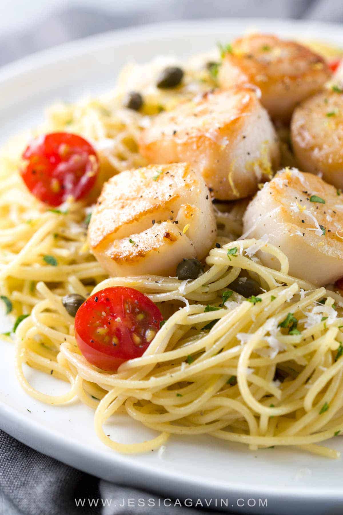 平底锅烤扇贝配柠檬山柑意大利面是任何场合的美食食谱!淡天使发意面与柑橘白葡萄酒酱汁和番茄拌在一起。