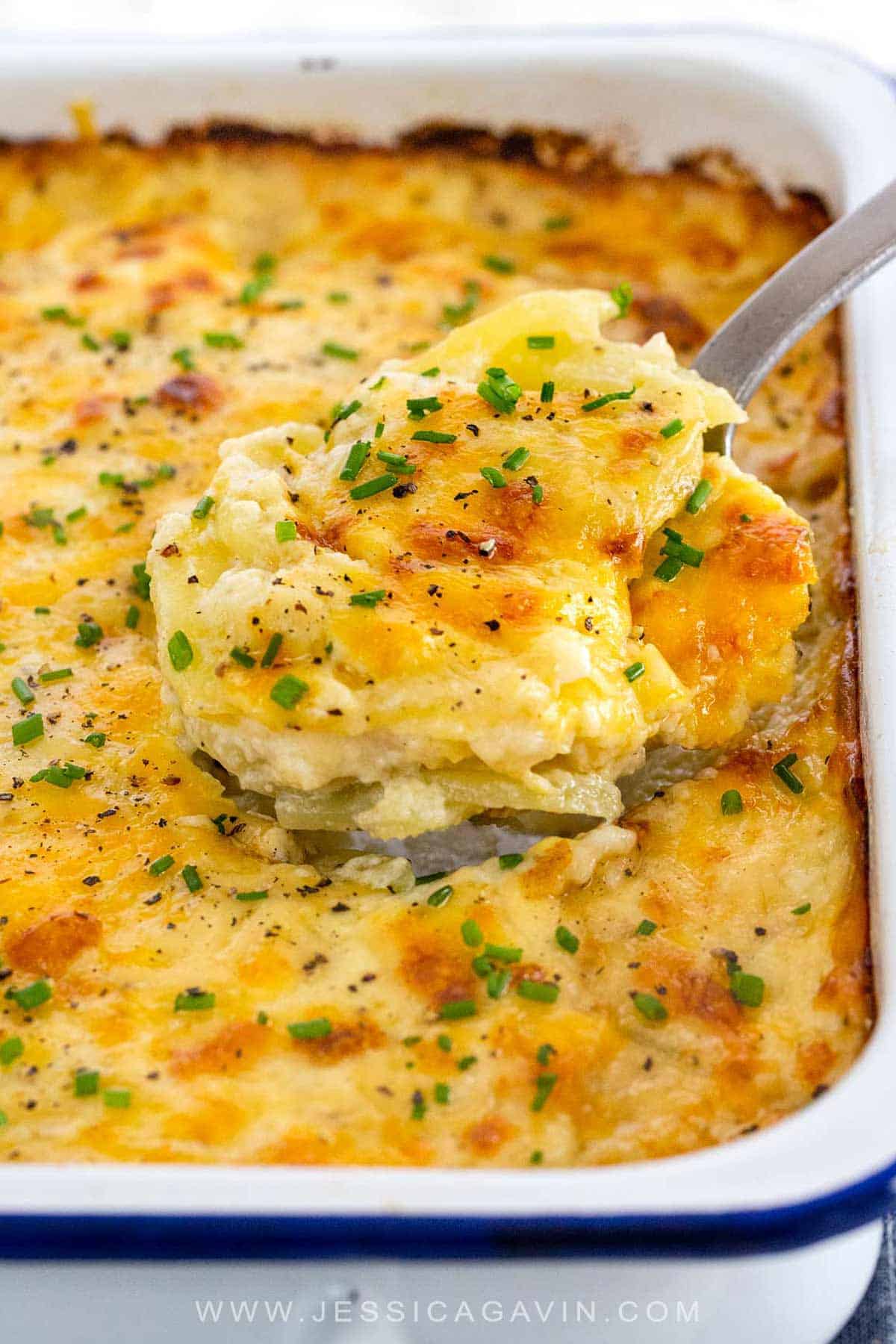 用一个大勺子挖出芝士土豆的层。每一口都融化在你的嘴里,大蒜和肉豆蔻的味道渗入每一片。这道配菜可以提前做好,然后在上菜前烤好。我的家人也喜欢吃剩的土豆,它仍然是美味的加热!