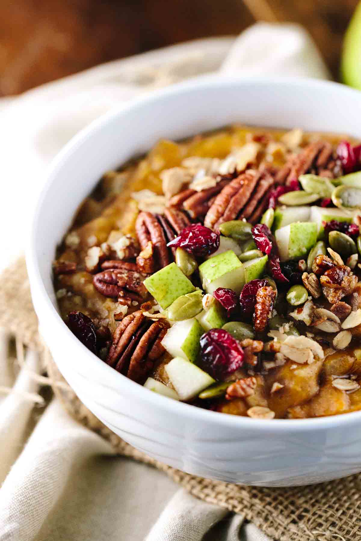 每一碗都盛满了温暖的香料、煮熟的梨、天然甜南瓜泥和营养丰富的燕麦。拿上你信赖的慢炖锅,开始吧!这顿早餐的每一碗都是轻煮的,以确保钢切燕麦增稠成奶油燕麦片,有一点嚼劲。它是美味的!