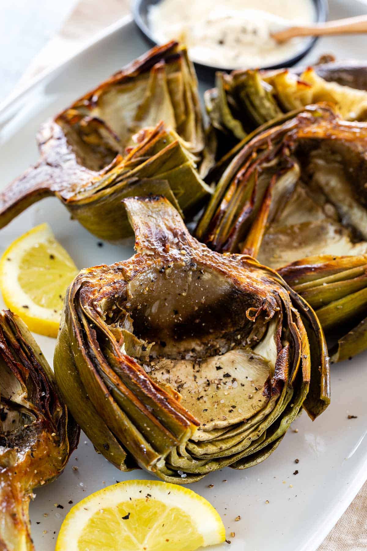 季节朝鲜蓟与更多的盐和胡椒,并用柠檬楔子提供温暖。