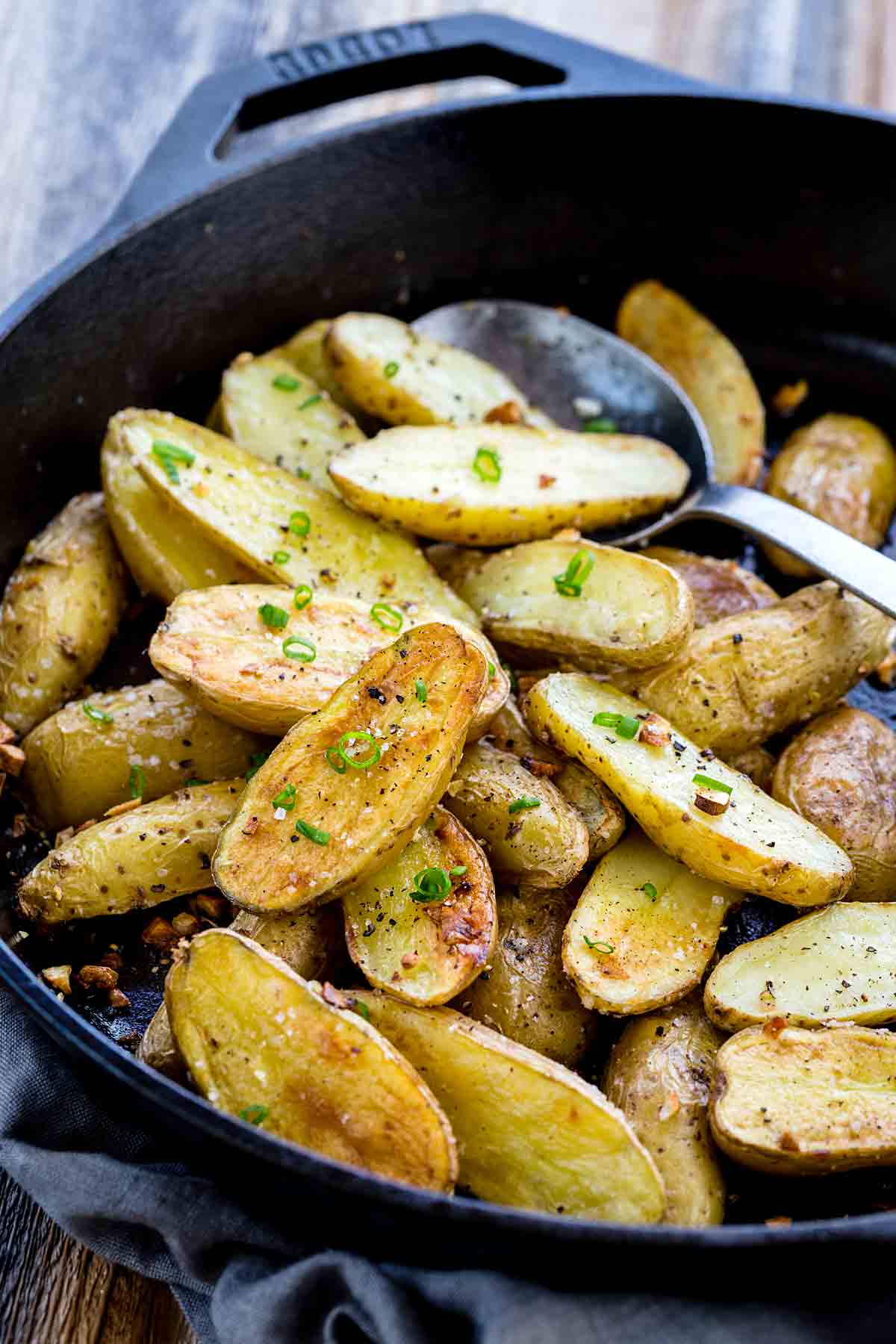 使用我的碳钢煎锅,效果非常好。我用了蒜粒,海盐和胡椒粉。完美的。这是我吃过的最好的烤土豆。谢谢你的收据。