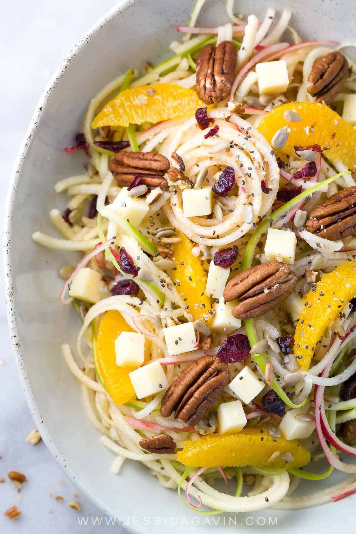 健康的螺旋苹果沙拉只需要15分钟!一款清爽的沙拉,上面有橙子、山核桃、切达奶酪、蔓越莓、向日葵和奇亚籽。
