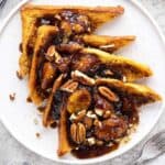 取出烤箱中的法式吐司转成服务板Spoon部分香蕉和酱 顶或侧喷雾切坚果