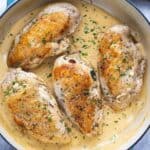 将锅放进烤箱和烤箱,直到肉不再粉色,内部温度达160至165oF(71至74oC)约10至15分钟,视厚度而定鸡转到干净盘子上 并用覆盖保暖留果汁在锅里