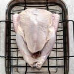 Prepare Turkey- Leave the turkey in its original packaging, or transfer it to a large plastic bag and seal it tightly. Place the turkey, breast-side up, on a rimmed sheet pan or roasting pan large enough that the turkey does not hang over.