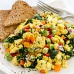 豆腐炒是一种美味的素食早餐,富含植物性蛋白质和蔬菜。加入一些姜黄可以使碎豆腐呈现出黄色和咸味。gydF4y2Ba