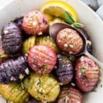 用一把小刀在每个土豆上切几片⅛英寸宽的土豆片,确保不要一直切下去,离底部留1 / 4英寸的空间。gydF4y2Ba