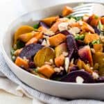 烤根茎蔬菜沙拉是一道丰盛而健康的菜肴。嫩甜菜、红薯、青菜和小麦拌入新鲜的柠檬蒜酱中。gydF4y2Ba