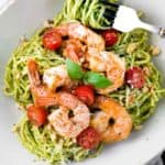 一个简单的30分钟香蒜沙司虾面食食谱。将新鲜的菠菜、芝麻菜、罗勒、核桃、帕玛森奶酪和橄榄油混合成一种快速酱汁。gydF4y2Ba
