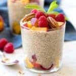 奇亚籽蛋白布丁每一杯都含有健康的营养成分,如纤维和益生菌。上面放着新鲜的桃子、覆盆子和坚果,这是一道美味的素食小吃。gydF4y2Ba