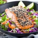芝麻三文鱼配凉拌米粉。松脆的卷心菜和胡萝卜拌上美味的蜂蜜酸橙酱。gydF4y2Ba
