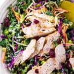 在一个大碗里混合西兰花茎和小花,羽衣甘蓝,胡萝卜,卷心菜,蔓越莓,葵花籽和鸡肉。gydF4y2Ba