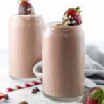 这款健康的巧克力草莓奶昔是和你的另一半分享的完美饮品!可可、草莓、香蕉和亚麻籽混合而成的清凉奶油。gydF4y2Ba