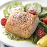 一个优雅的烤鲑鱼和芦笋馄饨晚餐食谱,只需30分钟!配以新鲜芦笋、芝士意面及柠檬香蒜沙司。gydF4y2Ba