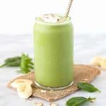 这个容易制作的超级绿色奶昔配方会让你在瞬间充满活力!这是抹茶、酸奶、杏仁、香蕉、菠菜和羽衣甘蓝的健康混合。gydF4y2Ba