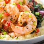 再放回锅里。把火调到中火,加入1 / 4杯磨碎的奶酪,搅拌至融化。再慢慢加入大约1 / 2到3 / 4杯腰果奶,直到粗面粉变得光滑奶油状。尝一尝,根据需要加入更多的盐和胡椒。煮虾时用小火加热。gydF4y2Ba