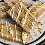 如果愿意,你可以在冰棒上加一些配料,比如融化的巧克力,撒上切碎的坚果。我用白巧克力和开心果做冰棍。gydF4y2Ba