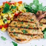 第一面猪肉盖上盖子,煮3分钟左右。翻过来,不盖盖子再煮1-2分钟,直到猪肉的内部温度达到135-140华氏度,或者直到不再是粉红色。从烤架上拿下来,转移到一个干净的盘子里。趁热搭配玉米沙拉食用。gydF4y2Ba
