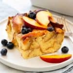 蓝莓面包布丁配时令夏日桃子。把烤好的奶油蛋糕浸泡在甜奶油中,然后在上面放上水果。gydF4y2Ba