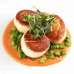 焦化扇贝加烤红辣椒culis很容易快速准备