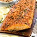 烤雪松板三文鱼配自制香草香料。在木头上烹饪会给这条鲜嫩的鱼注入美味的烟熏味。gydF4y2Ba