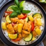 在速溶锅上选择“炒”,一旦酱汁开始沸腾,加入甜椒,西葫芦和菠萝。gydF4y2Ba