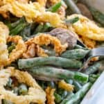 这道绿豆砂锅配菜以酥脆的豆子和奶油蘑菇酱拌在一起,上面放着酥脆的炸洋葱圈。gydF4y2Ba
