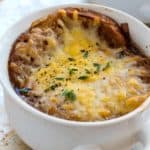 向4个12盎司的碗中加入汤,在上面放上1到2片烤面包片,在每片面包上均匀地撒上奶酪。或者,你可以用两个更大的24盎司的碗来做更大的分量。把碗放在烤盘上。gydF4y2Ba