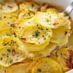 用奶油蒜和香草酱烤的扇贝土豆。薄片的育空金土豆在这个砂锅中形成了柔软的层。gydF4y2Ba