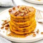取1 / 4杯(60毫升)煎饼面糊放入锅中,每次2到3杯。用勺子的背面把煎饼涂成一个直径约3.5英寸的圆形。gydF4y2Ba