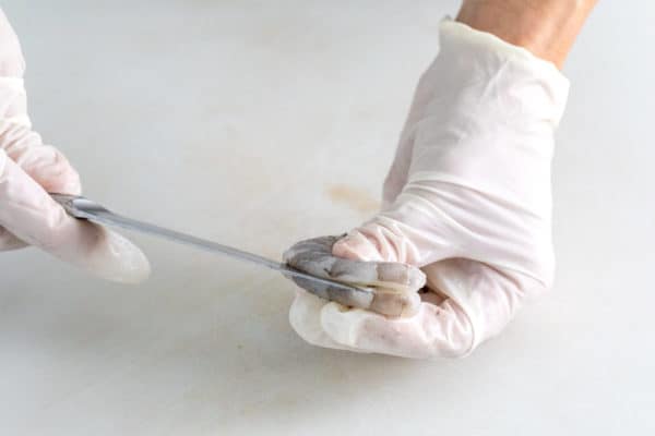用削皮刀在虾背上切一个又长又浅的口子,切到虾尾处。gydF4y2Ba