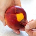 用手去皮器,用轻微的压力去除桃子的皮,并持续向下拍打。从茎的顶部开始向下移动到底部。把桃子剥去皮,直到没有皮为止。gydF4y2Ba
