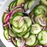 将黄瓜和红洋葱切成1英寸厚的薄片。gydF4y2Ba