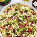 在一个大锅中,将水煮沸。加入1汤匙盐。搅拌直至溶解。将Orzo添加到沸水中,偶尔搅拌以防止面条粘在一起。如果水开始泡沫,则减轻热量。根据包装方向,大约10分钟或直到比Al Dente略微更柔软地烹饪意大利面。GydF4y2Ba
