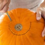 用雕刻锯以45度角在一个圆圈中切割底部。把锅盖弄大一点,可以装下勺子和你的拳头。保留盖子,或者扔掉,这取决于你打算如何点燃南瓜。