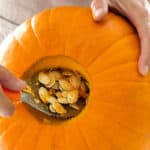 使用刮刀勺或大勺子以螺旋运动刮刮内壁。用勺子或手把粘稠的东西舀出来。用勺子进一步刮擦和清洁墙壁。用厨房毛巾擦拭南瓜的外部,清洁并擦干表面。