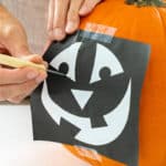 用胶带把图案贴在南瓜最平的部分。用一个有针尖的工具,或者别针在纸上穿一个洞,间隔大约⅛英寸。把纸拿开,用可擦的或永久的记号笔把这些点连起来。削皮刀也可以用来做一个浅切口,以跟踪设计。不要忘记保存设计以供参考。或者,在纸上剪下设计的部分来制作模板,然后在上面画出图像。你也可以把照片贴在南瓜上,然后用塑料把它紧紧地包裹起来,以固定图像。