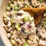 In a large bowl, add the diced turkey, mayonnaise, celery, apple, red onion, cranberries, pecans, mustard, honey, apple cider vinegar, rosemary, salt, pepper, and garlic powder.